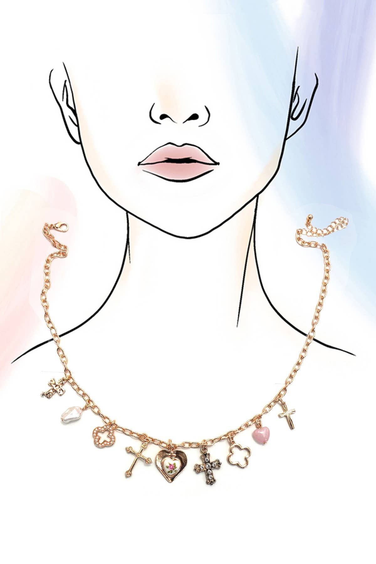 The Charm Necklace Clover, Cross, Porcelain Flower is a delicate and meaningful accessory that blends faith, luck, and beauty in one elegant design. Featuring a lucky clover, a timeless cross, and a finely crafted porcelain flower, this necklace offers a vintage inspired charm with a modern twist.