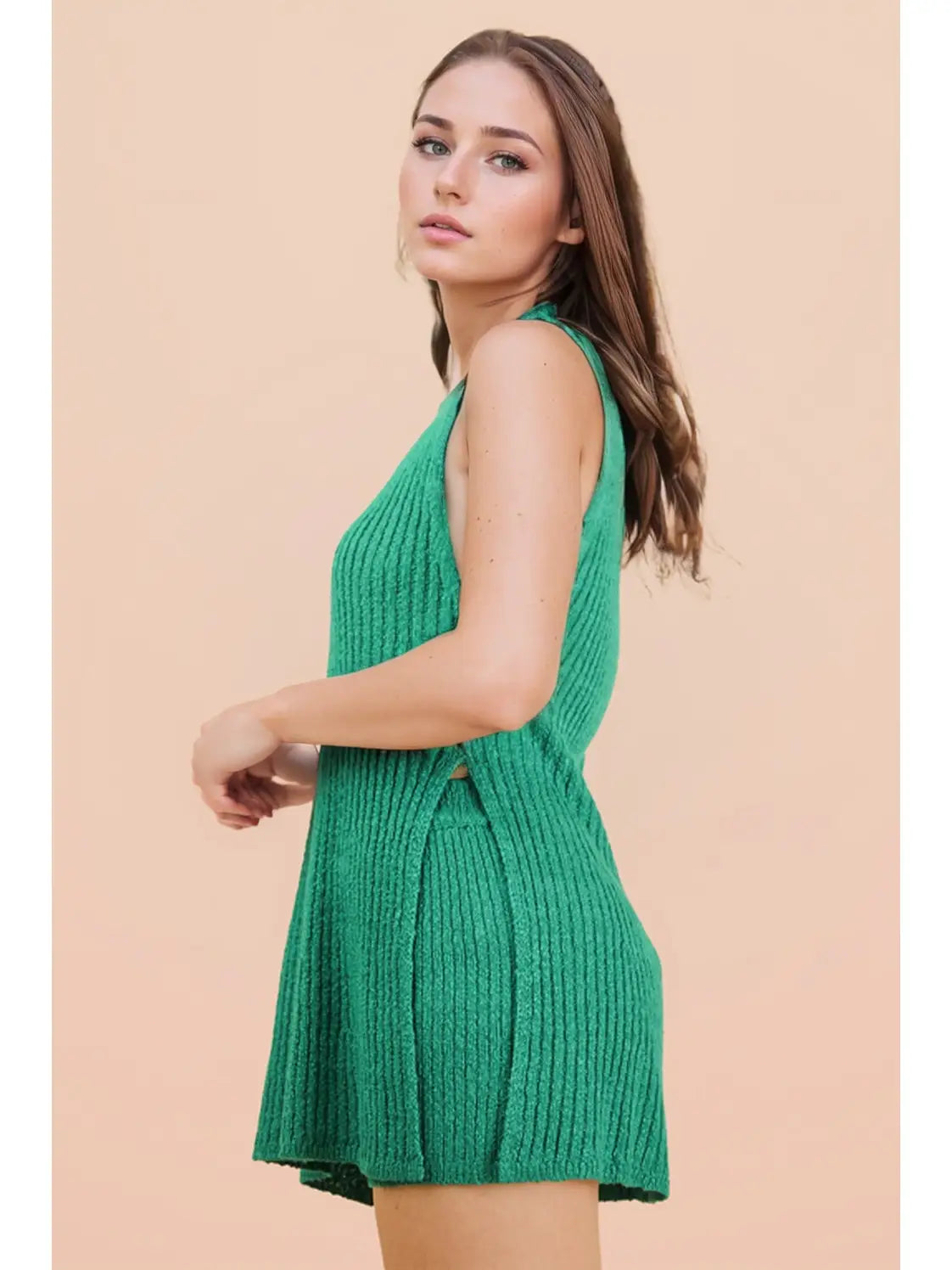 GREEN SLEEVELESS TUNIC KNIT SWEATER WITH SHORTS SET